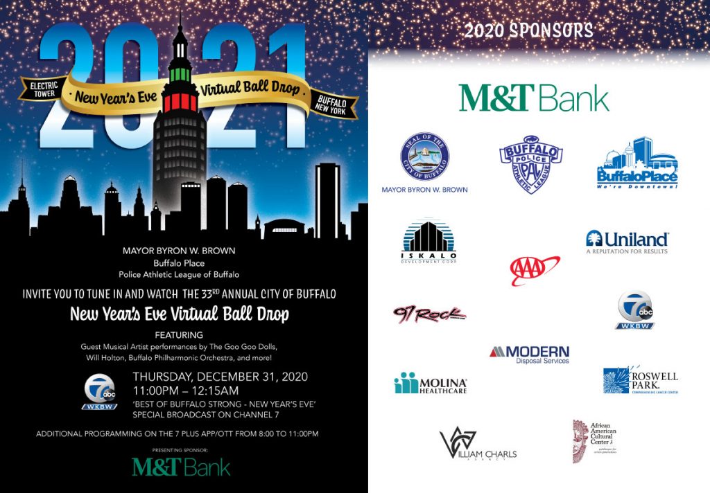 Mayor Brown stated, “In a year of cancellations, there’s one party that can’t be postponed. Buffalo’s Virtual New Year’s Eve Ball Drop on 7 ABC will be a great place for everyone to gather safely to celebrate the start of the New Year. I want to thank our many great partners and sponsors for teaming up with the City of Buffalo and Police Athletic League of Buffalo to bring