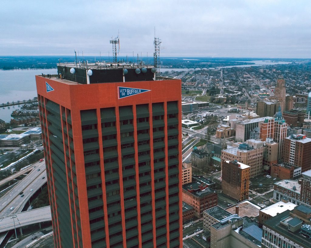 It’s a bird. It’s a plane. It’s Oxford Pennant at 529 feet! To celebrate the Buffalo Bills clinching the AFC East Division title and their upcoming playoff run, Oxford Pennant has gone BIG. Like flying 40-foot pennants on top of Western New York’s tallest building BIG!