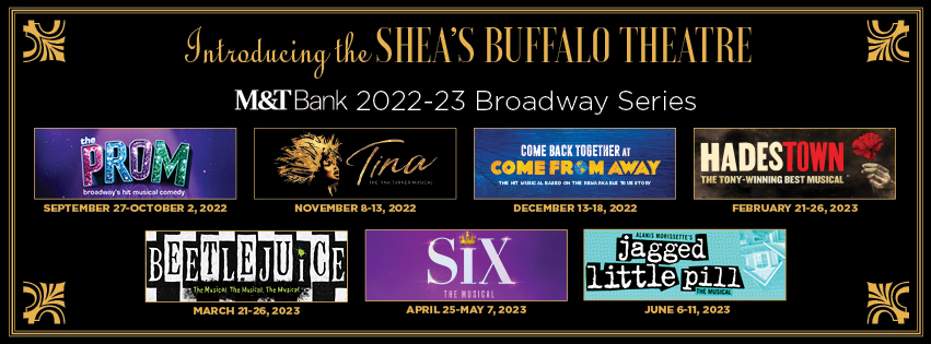 Shea’s Performing Arts Center has announced their M&T Bank 2022-2023 Broadway Series and Special Engagements. The season includes thrilling new productions and beloved favorites beginning this September. The Broadway Series will include: The Prom, Tina – The Tina Turner Musical, Come From Away, Hadestown, Beetlejuice, Six, and Jagged Little Pill. Special Engagements for the year will be Disney’s Aladdin and Dear Evan Hansen. For more information, or to purchase tickets, click here.