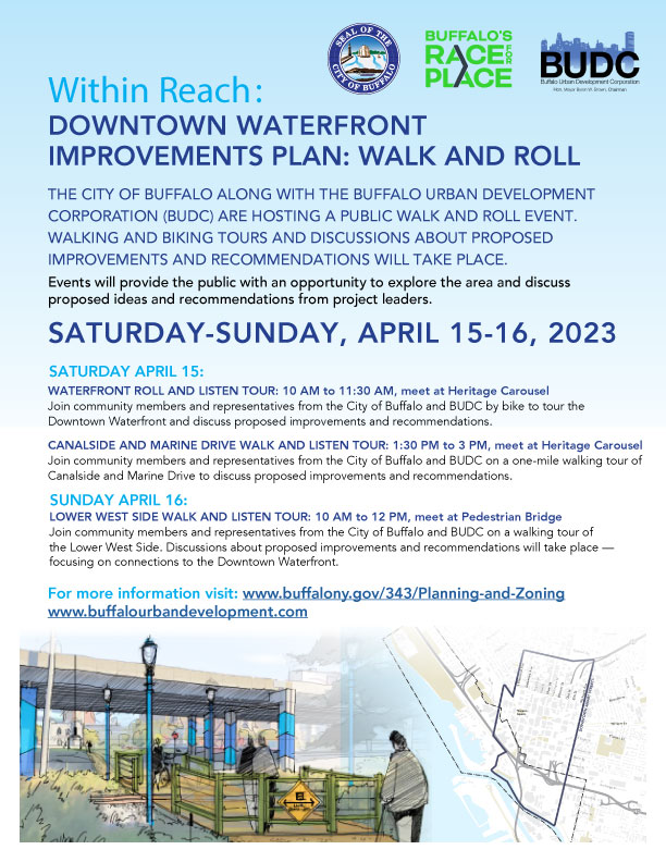 The City of Buffalo along with the Buffalo Urban Development Corporation are hosting a public walk and roll event this Saturday and Sunday, April 15th and 16th. Walking and biking tours and discussions about proposed improvements and recommendations will take place. The events will provide the public with an opportunity to explore the area and discuss proposed ideas and recommendations from project leaders.