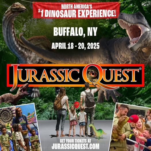 There’s no better place to make pter-iffic memories playing with adorable baby Dinos, excavating fossils, or even training a raptor while being surrounded by behemoths like sky-scraping Spinosaurus and, the King himself, Tyrannosaurus rex! Get your tickets for Jurassic Quest now, before they go EXTINCT! Jurassic Quest will roar into the Buffalo Convention Center, Friday, April 18th through Sunday, April 10th. Jurassic Quest is the world’s largest, most popular Dino event with unique and exciting experiences for the whole family. Observe a herd of life-size dinosaurs including Apatosaurus, Spinosaurus, and an incredible T.rex!