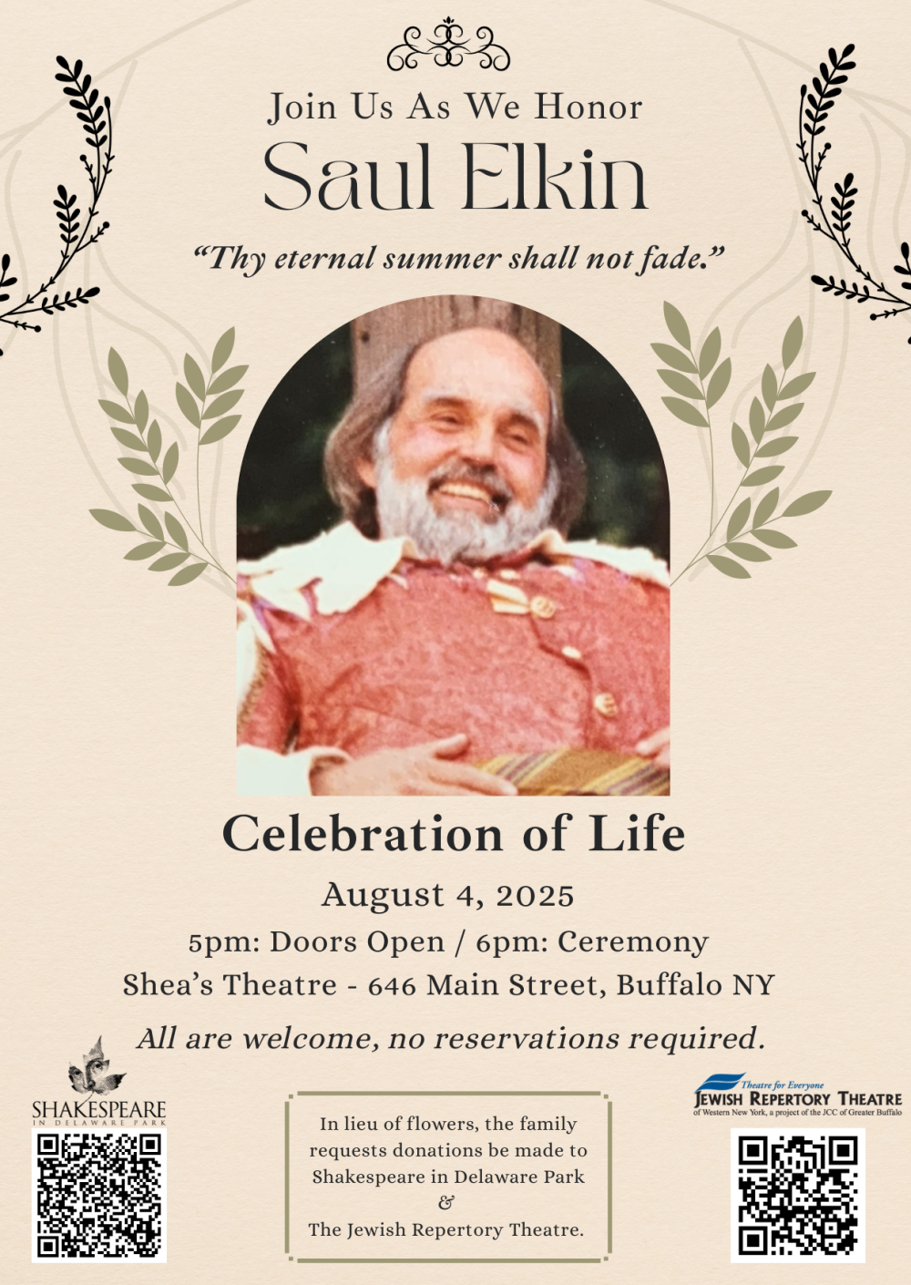 A Celebration of Life Honoring Saul Elkin will be held on Monday, August 4th from 5pm to 7pm at Shea’s Buffalo Theatre.