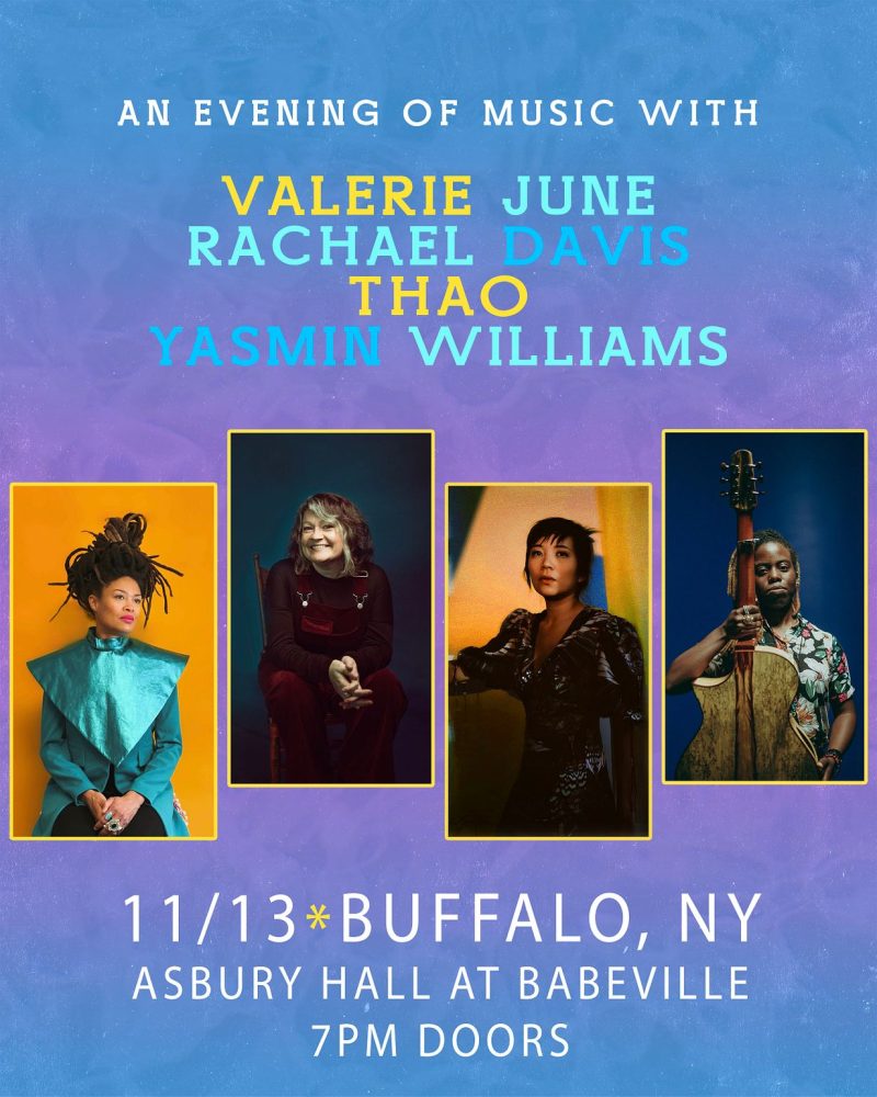 On Monday, November 13th at 8pm, join A Musical Conversation with Valerie June, Rachael Davis, Thao & Yasmin Williams at Asbury Hall. This group is a collective of multi-instrumentalists influenced by a kaleidoscope of musical traditions. All these powerful artists were invited by the visionary promoter, Anya Siglin, to perform at the Ann Arbor Folk Festival. After an exhilarating evening of songs and stories that transfixed the audience, each artist was excited to take the show on the road. Their performances weave interactive conversation segments with songs in a Nashville-style round. This powerhouse collective of women from uniquely different backgrounds, ages, and views share united auras of sound and music. Grab your tickets here!