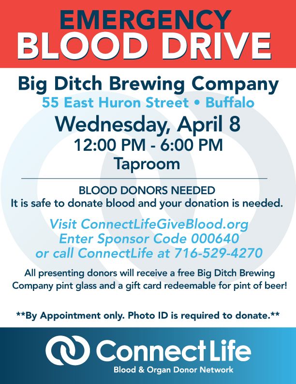 Wednesday, April 8th, Big Ditch Brewing Company will host an Emergency Blood Drive with ConnectLife Blood & Organ Donor Network from 12noon to 6p. It is safe to donate blood and your donation is needed. All presenting donors will receive a free Big Ditch Brewing Company pint glass and a gift card redeemable for a pint of beer.
