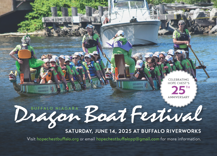 Dragon boating is a boat of 20 paddlers, a drummer and a steer person. It is a team sport that requires power, speed, synchronization, and endurance. With its beginnings in Southern China, dragon boating today is the fastest growing international team water sport and soon to be an Olympic event. Race festivals are held year-round at numerous locations around the world and now proudly in Buffalo!