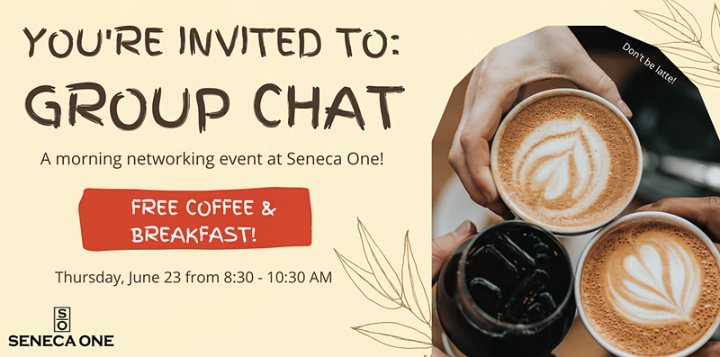 Thursday, June 23rd, join Seneca One in their main lobby for a networking event, GROUP CHAT. Networking begins at 8:30am and registration is free. For more information or to register, click here.