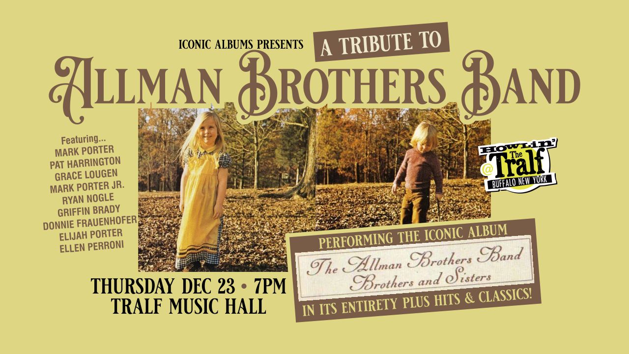 Thursday, December 23rd, Howlin’ at The Tralf presents Iconic Albums: A Tribute to Allman Brothers Band. Performing the iconic album “Brothers and Sisters” in its entirety. Featuring Mark Porter, Pat Harrington, Grace Lougen, Mark Porter Jr., Ryan Nogle, Griffin Brady, Donnie Frauenhofer, and Elijah Porter. Doors will open at 6pm and admission is $19 in advance and $22 on the day of the show. For more information, or to purchase tickets, click here.