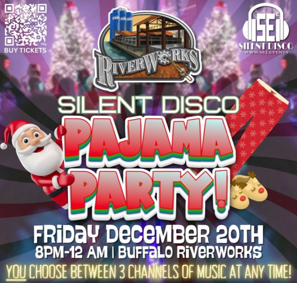 Get ready to jingle and wiggle at the ultimate Silent Disco Pajama Party this Holiday Season! Join at Buffalo RiverWorks on December 20th for a night of festive fun where you can dance in your coziest pajamas while choosing from three exciting channels of music. Whether you’re in the mood for classic throwbacks, upbeat dance tracks, or hip hop vibes, the power is literally in your hands to switch it up at anytime!