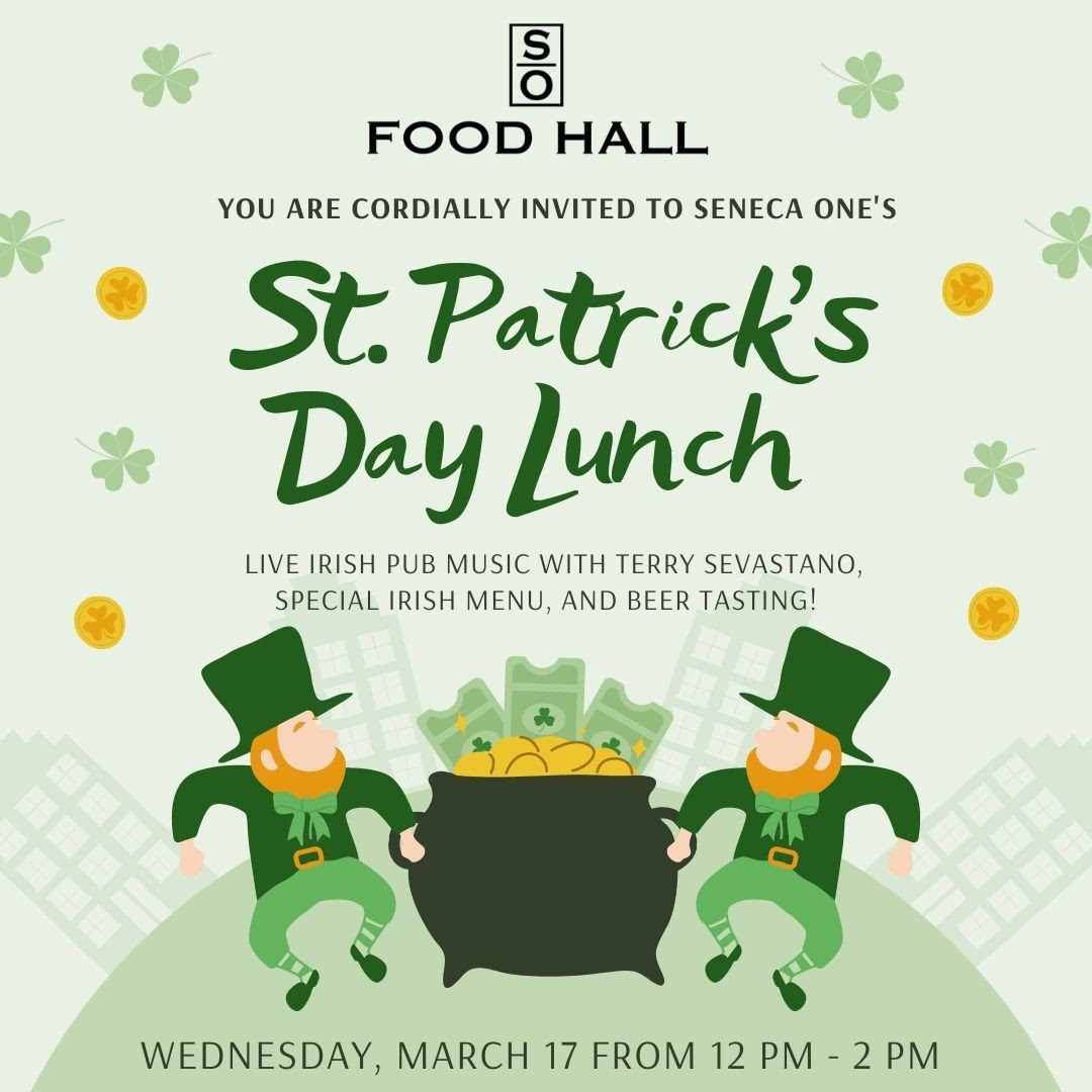 Join the Douglas Development and Seneca One Food Hall teams on St. Patrick’s Day for a very special luncheon on the luckiest day of the year, Wednesday, March 17th! Guests will enjoy special Irish menu items. Terry Sevastano, famous for his Irish music and pub banter, will perform from 12noon to 2pm in the Food Hall.