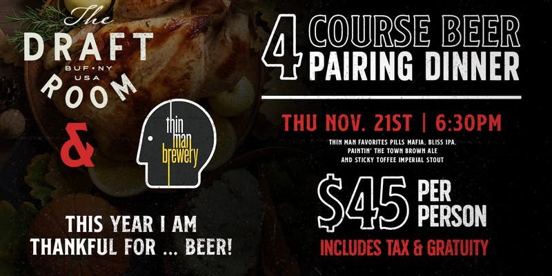 The Draft Room and Thin Man Brewery are teaming up for a 4-course Thanksgiving themed beer pairing dinner, on Thursday, November 21st at the Draft Room.