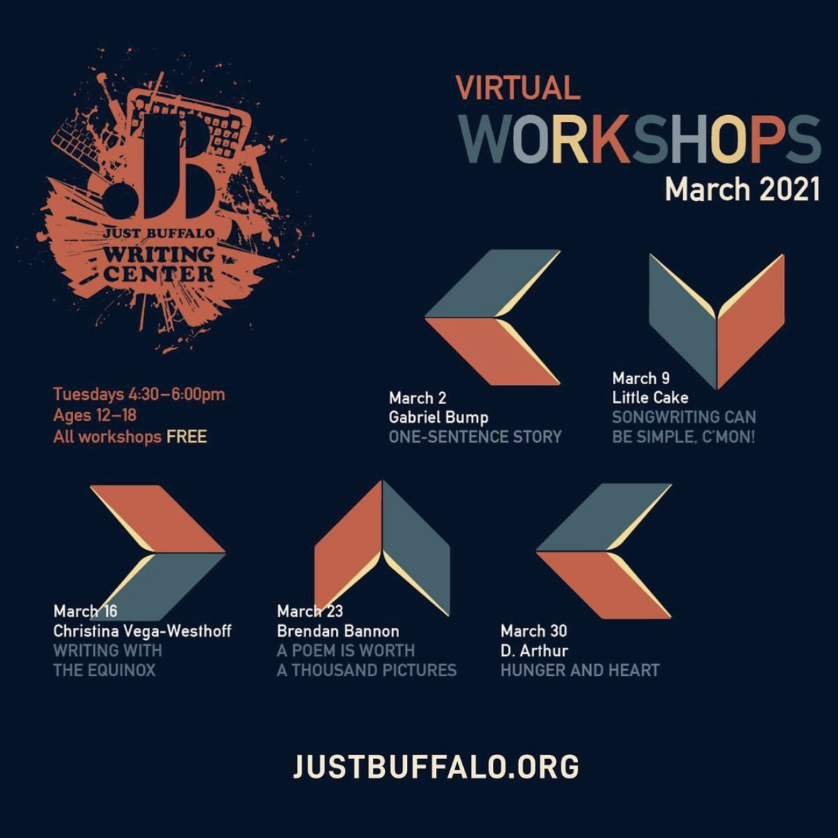March at JBWC is underway! Tomorrow, write songs with @welcome2littlecake! Email jbwc@justbuffalo.org to sign up for any & all of JBWC’s free, virtual workshops for young writers. They’d love to see you there! (And by you, they mean your lovely face or your muted screen, because audio & video are always optional.)