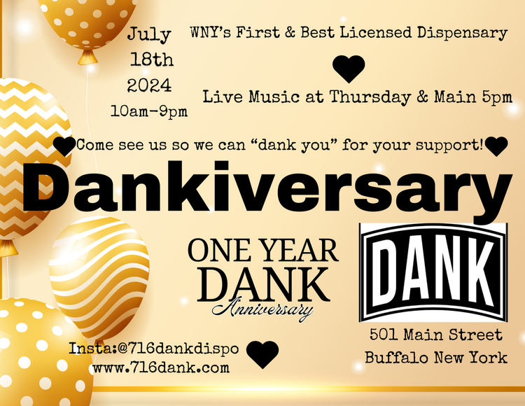 Celebrate 1 year of business at Dank716 on Thursday, July 18th! Click here for full details.
