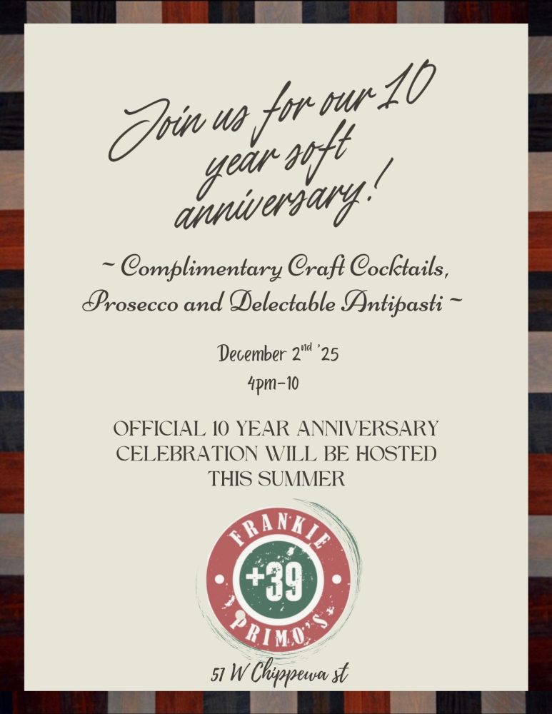 Join at Frankie Primo’s +39 on Tuesday, December 2nd for an evening of gratitude, celebration, and community! To thank you for your support over the past decade, Frankie Primo's be offering complimentary craft cocktails, prosecco to toast the occasion, and a delicious selection of antipasti. This event is a soft kickoff to Frankie Primo's anniversary […]
