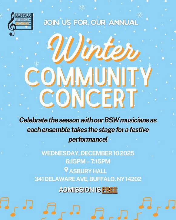 Come celebrate the season at Buffalo String Works’ Annual Winter Community Concert - an evening of music, joy, and community at Asbury Hall on Wednesday, December 10th! This year’s concert will showcase the hard work and dedication of students and teaching artists throughout the fall semester. You’ll hear performances from each team’s Large Ensemble, including […]