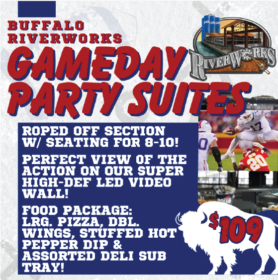 Watch the Buffalo Bills take on the Dallas Cowboys on Sunday, December 17th at RiverWorks! Grab your own VIP roped off section on the main floor or balcony, with the best view of all the action! A VIP suite includes seating for up to 10 people, full service food and beverage brought right to your […]