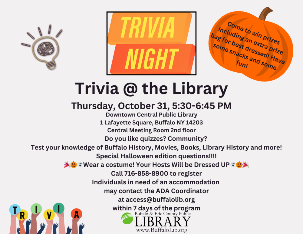 Check out Trivia Night at the Central Library on Halloween night, Thursday, October 31st! Test your trivia prowess at this 18+ event! Dress up as hosts will be in costume and someone will win an extra prize for best dressed! Click here to register.