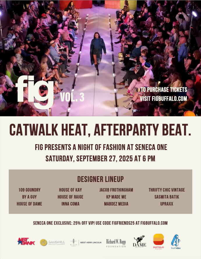 Fig™ is where high fashion and high style converge for an unforgettable evening on Saturday, September 27th! Models will take to the runway at Seneca One in creations by Buffalo’s top designers, seamstresses, leather craftsmen, milliners, tailors, and the many talented individuals driving the local fashion industry. Enjoy cocktails, hors d’oeuvres, and live music, accompanied […]